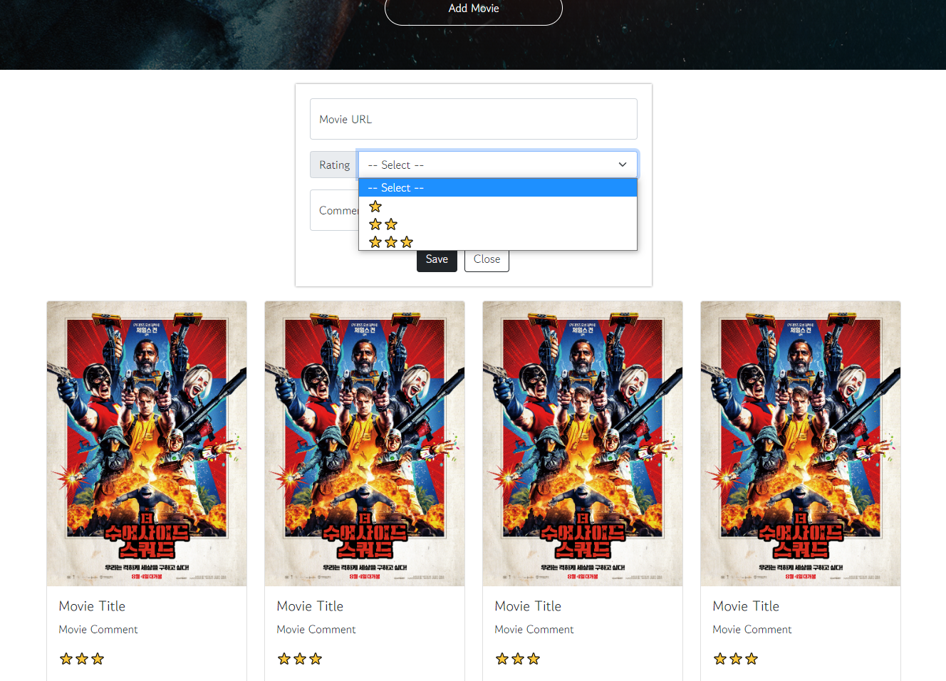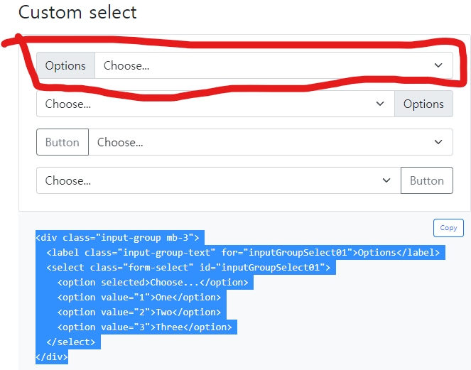 부트스트랩에서 사용할 요소의 코드를 가져온다. 예시를 보면 '별점'이라는 설명과 드롭다운이 같이 있으므로 형식에 맞는 코드를 찾아서 사용한다.