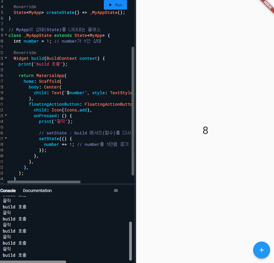 코드를 실행시켜보면 처음에 화면에는 1이 출력되는데 아래의 + 버튼을 클릭할 때마다 값이 1씩 증가하는 화면이 다시 그려지게 된다.