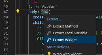 추출하고자 하는 위젯을 클릭하고 Refactor를 켜주면 Extract Widget이라는 기능이 있다.