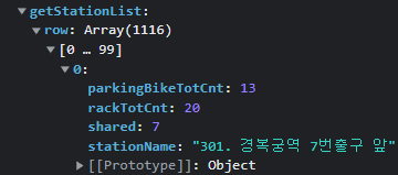 stationName, rackTotCnt, parkingBikeTotCnt 값을 출력해 본다.