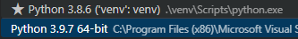 그러고 나서 현재 프로젝트에서 사용 중인 파이썬을 변경해주어야 한다. vscode 하단에 보면 파이썬과 버전 정보가 보이는 곳이 있는데 여길 클릭하고 Python 3.8.6 venv를 선택해 준다.