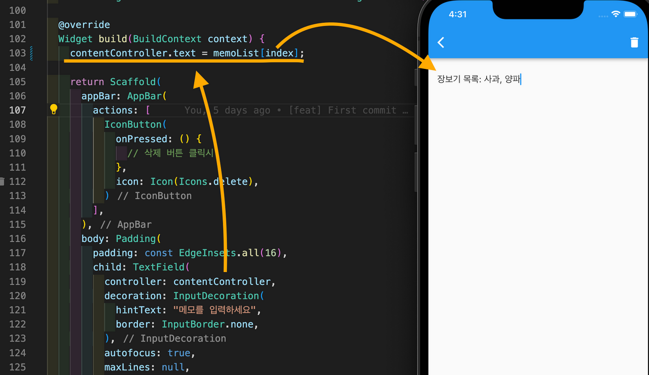 이제 목록에서 텍스트를 클릭하면 해당 리스트의 텍스트를 DetailPage로 전달해서 메모 내용이 보이도록 한다.