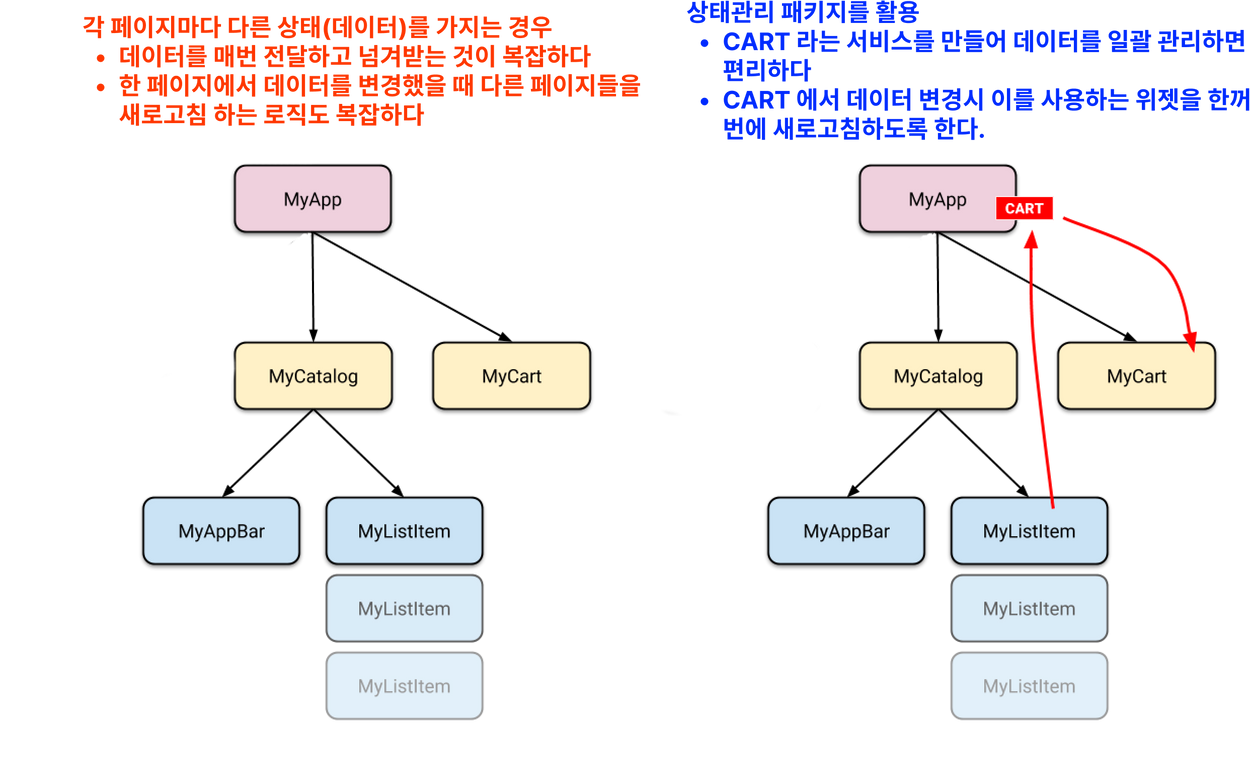 소규모 프로젝트의 경우 상태관리가 없이도 충분히 진행이 가능하다. 하지만 서로 다른 페이지의 화면을 갱신해 주는 기능에서부터는 까다로워지는데 물론 부모 위젯의 setState를 자녀 위젯으로 넘겨주고 자녀 위젯에서 부모 위젯의 화면을 갱신하도록 할 수 있지만 이 방법은 페이지가 조금만 많아져도 코드가 지나치게 복잡해지는 문제가 발생한다.