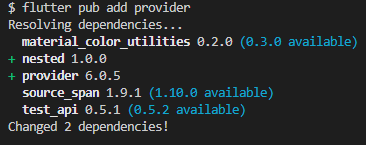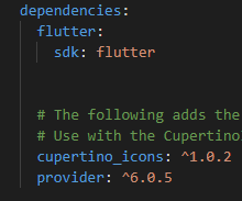 Provider 설치가 완료되었다. 패키지의 설치 유무는 pubspec.yaml 파일에서 dependencides에서 확인이 가능하다.