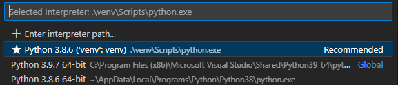 해당 명령어의 실행이 완료되면 venv 폴더가 생성된 걸 확인할 수 있다. 그리고 프로젝트 하단의 Selected Interpreter를 열어서 venv로 설정해 준다.