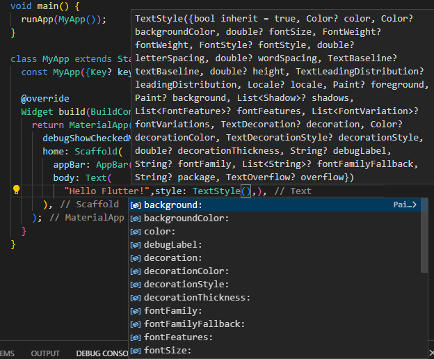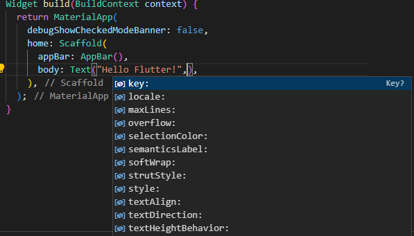 입력한 코드의 "Hello Flutter" 뒤에 콤마를 찍고 ctrl + space를 누르면 Text 위젯에서 사용할 수 있는 속성들의 목록을 볼 수 있다.