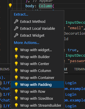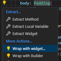 column을 사용하기 위해서 Text 위젯을 클릭하면 왼쪽에 노란색 전구가 뜨는 걸 확인할 수 있다. 이 기능을 Refactor라 부르며 해당 위젯을 다른 위젯으로 감싸거나 추출할 수 있도록 도와주는 기능을 한다.