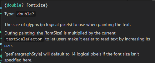 위젯에서 사용되는 속성이 어떤 타입을 필요로 하는지 확인하고 싶을 때는 해당 코드 위에 마우스를 올리면 볼 수 있다.