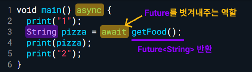 즉 비동기를 동기로 동작시키기 위해서는 await을 해당 코드 앞에 붙이면 되는데 코드가 속한 함수에 async를 넣어주면 동기 방식으로 실행이 가능하고 async가 선언된 함수의 반환값은 Future <return type> 형식으로 표현된다.