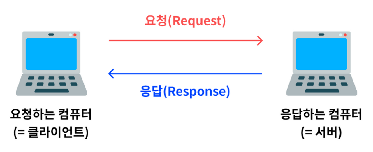 이러한 통신을 네트워크라고 하며 예를 들어서 네이버 주소로 접속했을 때 웹 브라우저가 네이버에 있는 컴퓨터로 요청을 보내고 네이버에서 다시 내 컴퓨터로 응답을 해주는데 이때 요청하는 컴퓨터를 클라이언트, 응답하는 컴퓨터를 서버라고 한다.