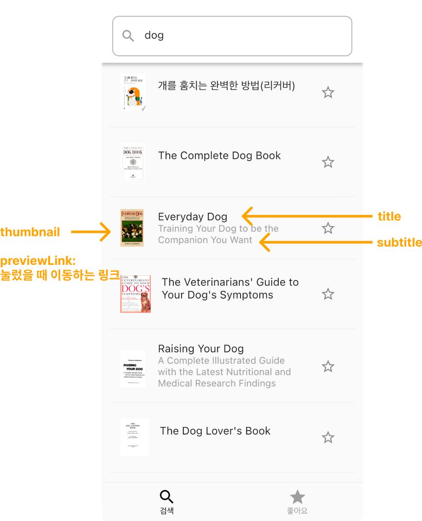 id, title, subtitle, thumbnail, proviewLink 이 정보들을 사용해서 앱에 책 리스트를 만들어내도록 한다.