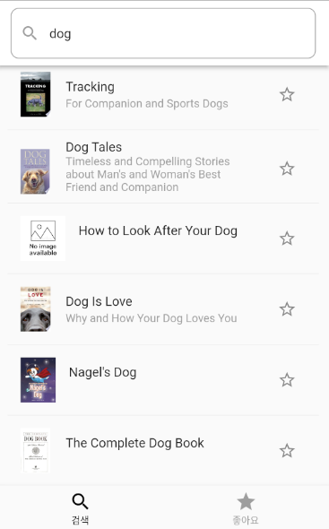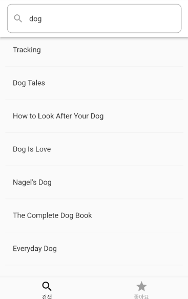 여기까지 검색 기능으로 서버에서 API를 통해서 해당 책들을 검색해서 나온 결과를 데이터로 받아와서 눈에 보이는 위젯으로 만드는 것까지 만들어졌다.