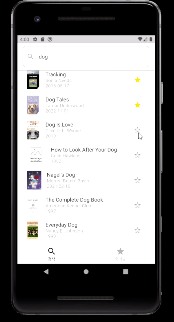 좋아요 이후 앱을 다시 시작해도 좋아요 한 책들이 유지되는 걸 확인할 수 있다.