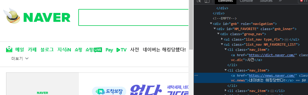 그리고 아무거나 요소를 선택해서 '우클릭 > 검사'를 클릭하면 개발자 모드 창이 활성화된다.