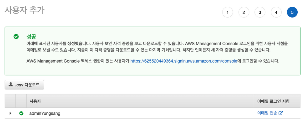 태그 추가 항목 다음 > 검토, 이름과 그룹 확인 후 다음 > 사용자 생성에 성공 후 링크 복사