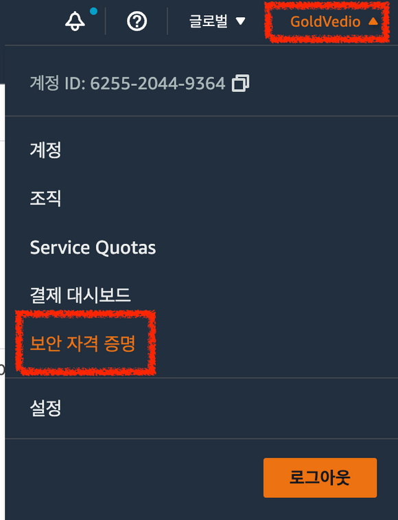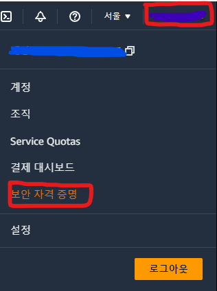 페이지에 접속해서 내 계정을 클릭하고 '보안 자격 증명' 페이지를 연다.