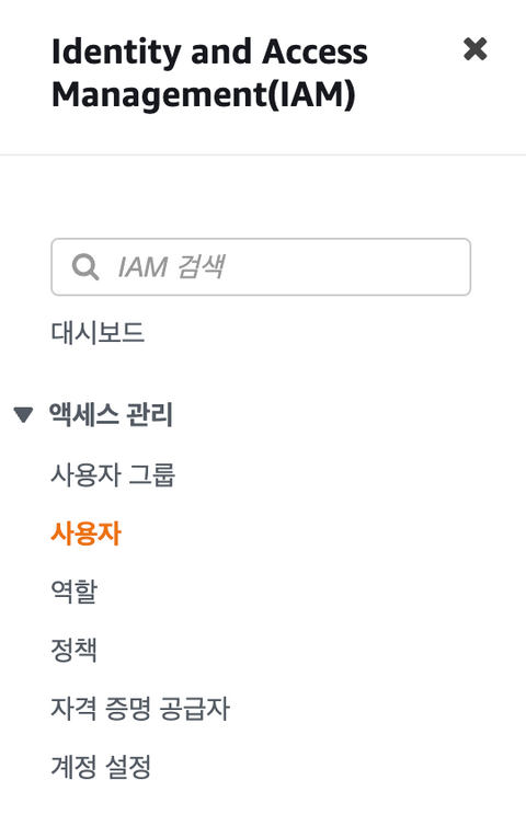 보안 자격 증명(IAM) 탭에서 액세스관리 > 사용자를 클릭한다.