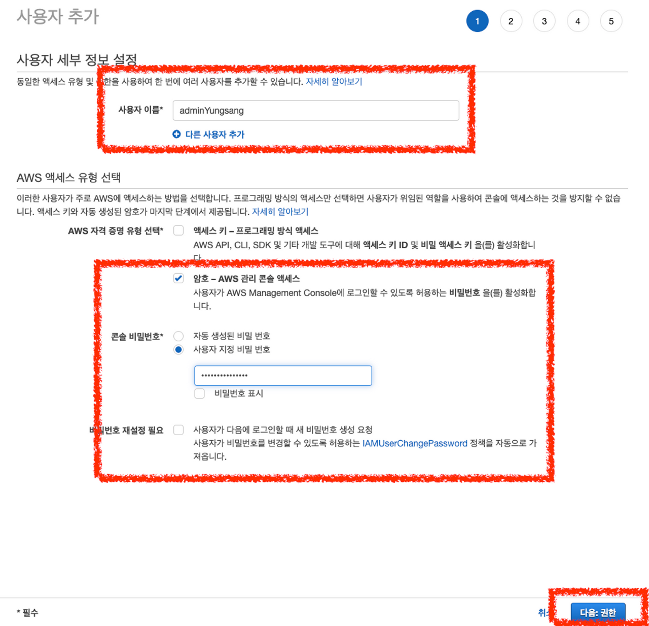 이름 입력 > 암호-AWS 관리 콘솔 액세스 > 사용자 지정비밀 번호 > 비밀번호 재설정 필요 체크 해제 > 다음:권한