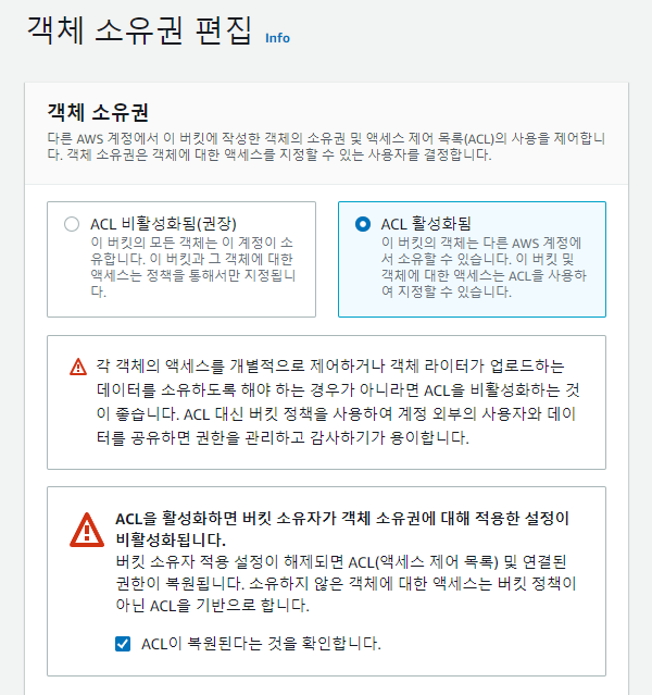 객체 소유권 제어 및 버킷에 대해 ACL 사용 중지 S3 객체 소유권은 액세스 제어 목록(ACL)을 사용 중지하고 버킷에 있는 모든 객체의 소유권을 가져오는 데 사용할 수 있는 Amazon S3 버킷 수준 설정으