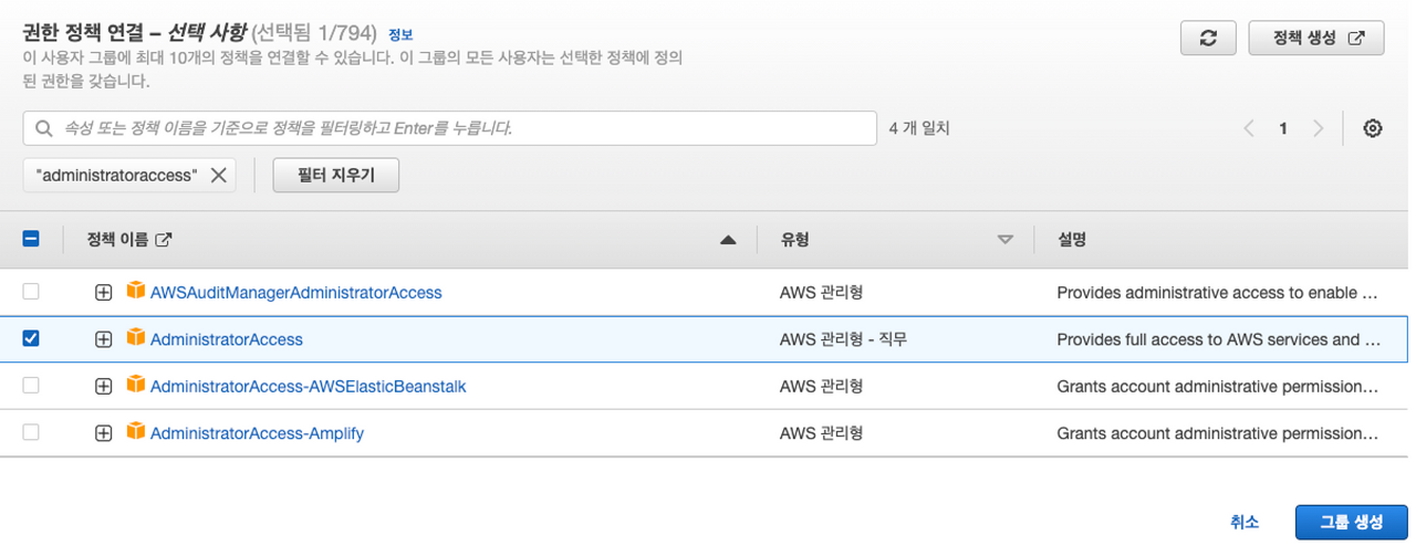 사용자 그룹 이름을 입력하고 권한 정책 연결에서 AdministratorAccess를 검색해서 체크한다.