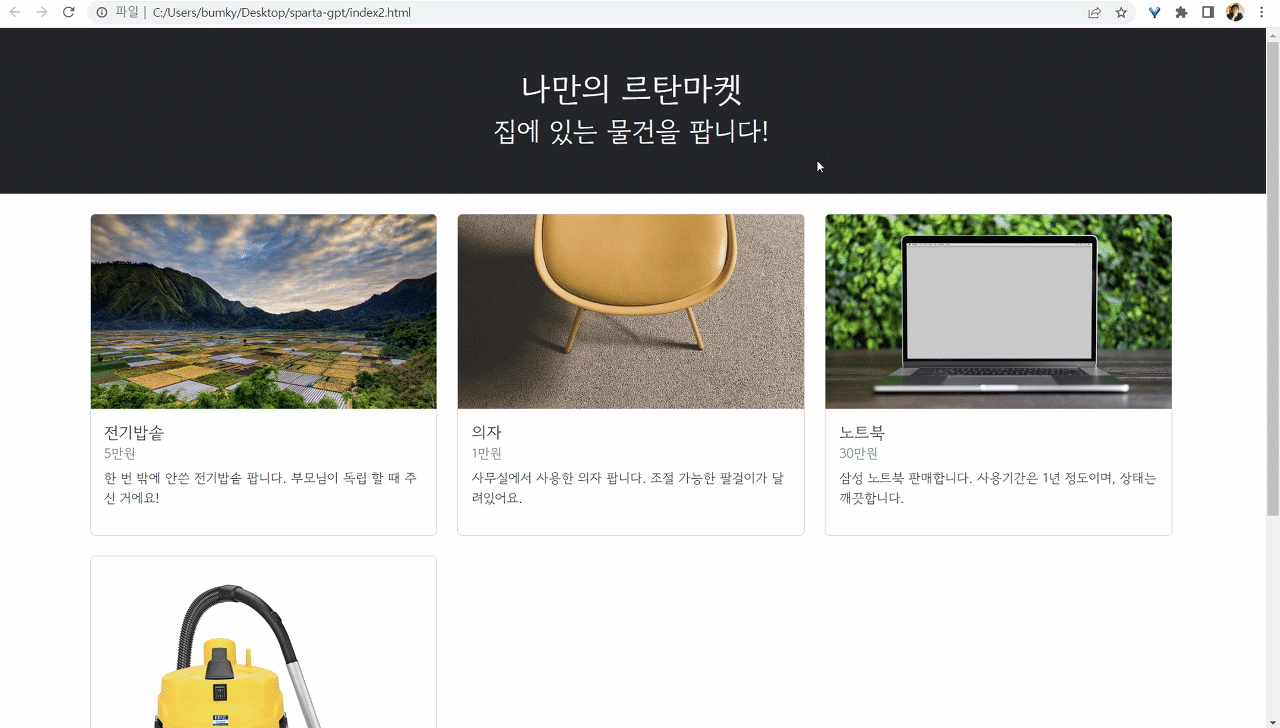 이 코드를 추가하면 "hero" 섹션이 생성되고, 섹션의 배경색은 어두운 색으로 설정되며, 흰색으로 표시된 "Bak's의 중고마켓"과 "집에 있는 물건을 팝니다!"라는 제목과 소제목이 표시됩니다.